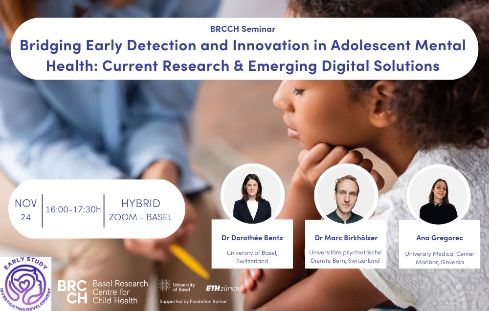 Bridging Early Detection and Innovation in Adolescent Mental Health: Current Research & Emerging Digital SolutionsPublic BRCCH-Seminar with Dr. Dorothée Bentz, Universität Basel, Dr. Marc Birkhölzer, Universitäre Psychiatrische Dienste Bern, and Ana Gregorec, University Medical Center Maribor