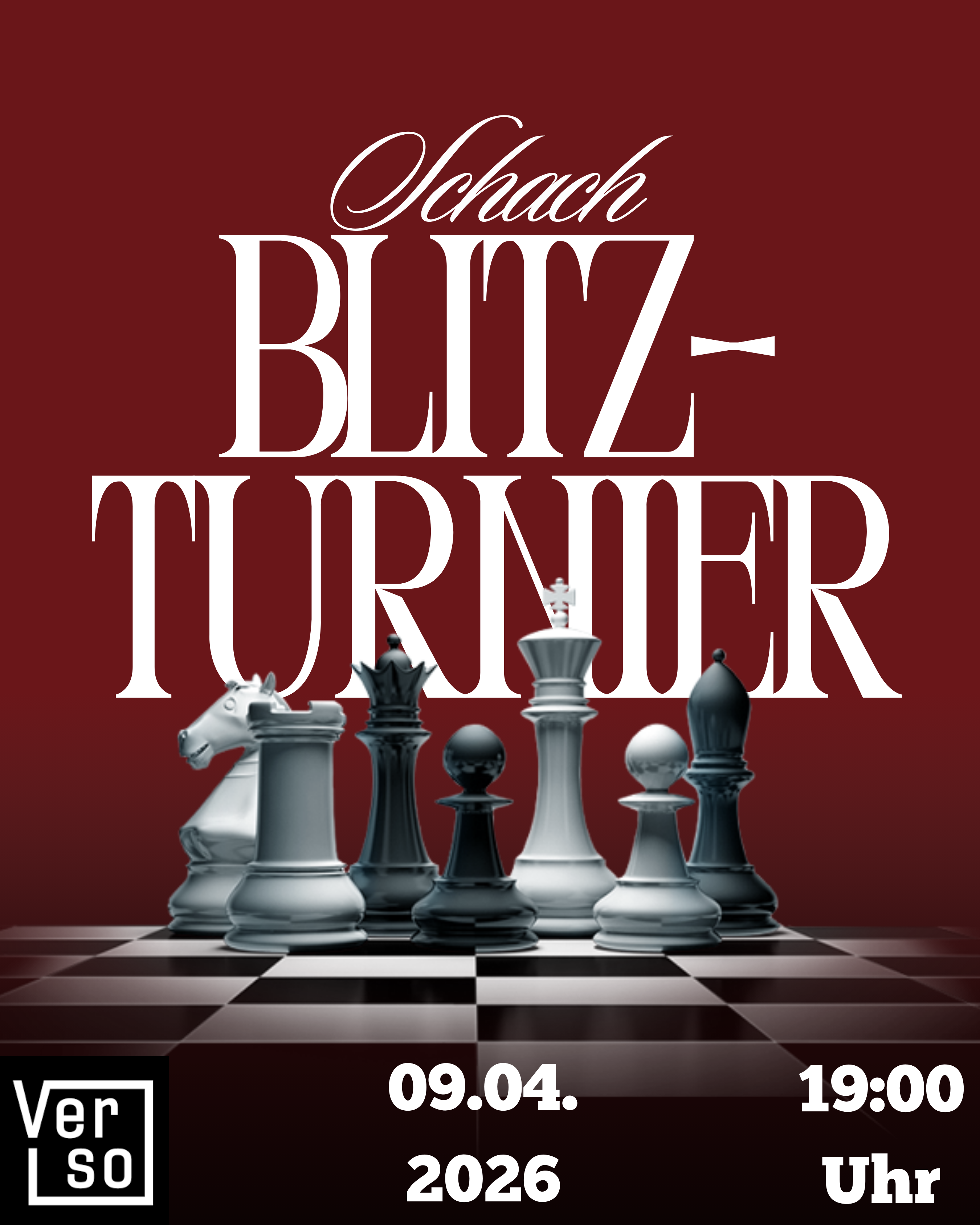 Zum ersten Mal bringen wir Blitz-Schach ins Verso! Egal, ob du regelmässig spielst oder einfach Lust auf schnelle Partien und einen entspannten Abend hast: Alle Studierenden sind herzlich willkommen!