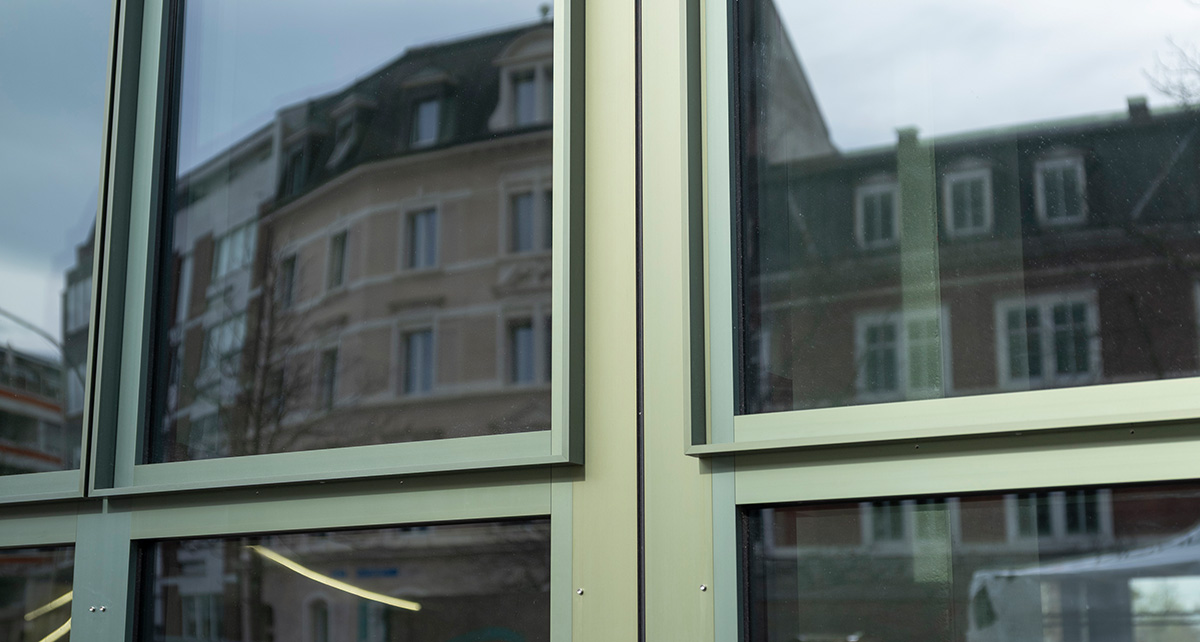 In design terms, the distinctive facade reflects the new building’s purpose. The innovative glass technology points to the research and scientific progress pursued at the Department of Biomedicine. The panes are framed by an anodized aluminum structure in a vivid shade of green. The overall appearance is reminiscent of industrial and technical architecture, emphasizing the building’s technical complexity and engineering focus.